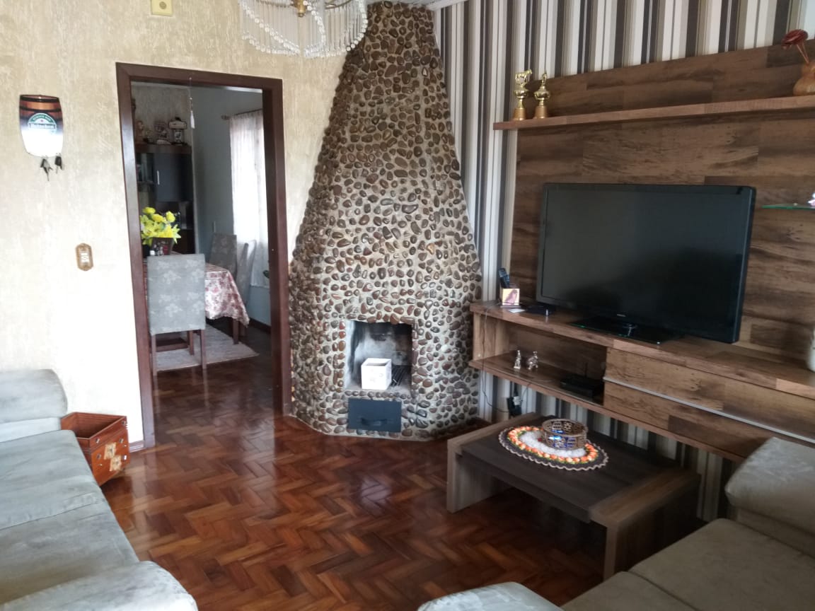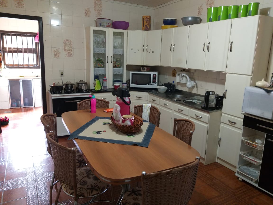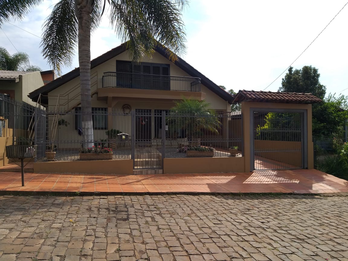 A casa é cercada e possui dois pisos, além de contar com 6 dormitórios, sala com lareira, cozinha, 3 banheiros, lavanderia, garagem para dois carros e piscina.
