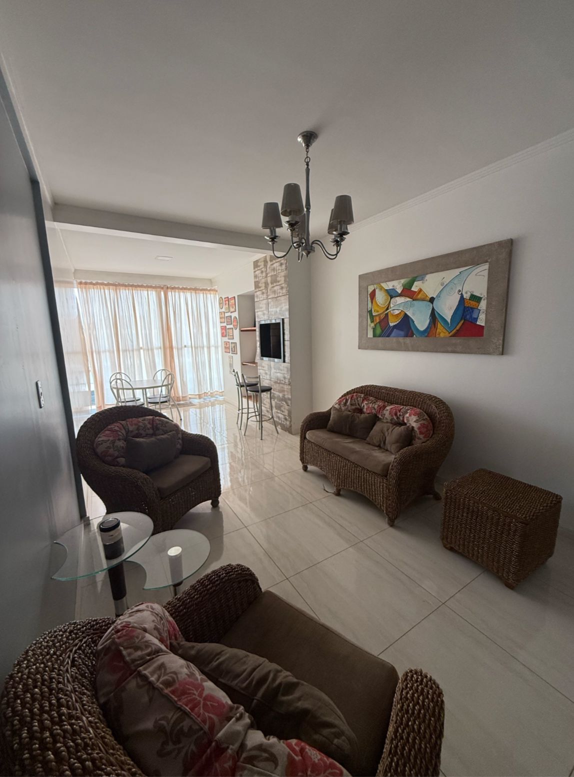 O apartamento conta com 2 dormitórios, sendo um uma suíte, 1 vaga de garagem, 2 banheiros, sala, cozinha, lavanderia, churrasqueira, internet e ar condicionado.